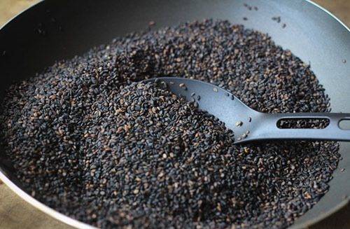 Cho vừng đen vào chảo rang đều tay với lửa nhỏ. Khi vừng đen có mùi thơm thì tắt bếp.